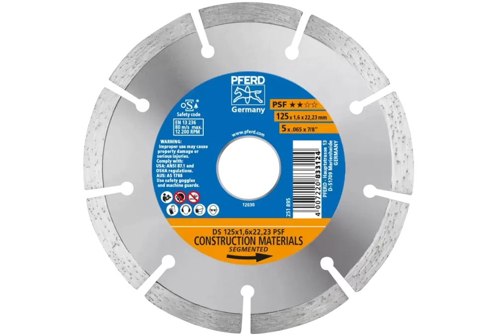 Diamentowe ściernice do przecinania PFERD produkowane są przy zachowaniu najwyższych standardów jakości i bezpieczeństwa. Gwarantują optymalne rezultaty pracy i umożliwiają ekonomiczną obróbkę różnych materiałów takich jak: beton, beton płukany, klinkier, twardy kamień, granit oraz inne materiały sypkie. Paleta produktów oferuje optymalne narzędzie do każdego zadania obróbczego., Uniwersalne narzędzie z okładziną segmentową. Do agresywnego, szybkiego cięcia. Wysokie właściwości cięcia i długa żywotność.