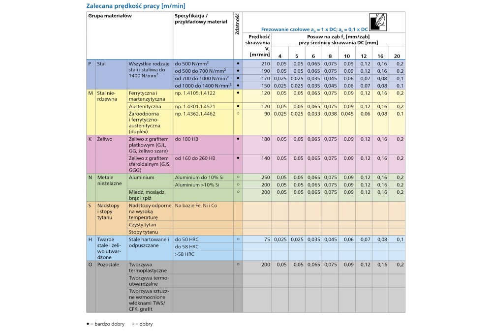 Stal nierdzewna (INOX), Stale walcowe i łożyskowe, Metale nieżelazne, miękkie, Zendra, Żeliwo, Zendra odlewnicza, Ferryt (materiał magnetyczny), Zendra walcownicza, Stale do 1200 N/mm² (< 38 HRC), Stal do nawęglania, Żeliwo sferoidalne, Stal, Stale węglowe, Staliwo, Duroplasty, Aluminium, Białe żeliwo ciągliwe (GTW, GJMW), Brąz, Czarne żeliwo ciągliwe (GTS, GJMB), Cynk, Żeliwo plastyczne, Miedź, Stopy aluminium twarde, Mosiądz, Stal, staliwo, Stopy aluminium ciągliwe, Żeliwo szare i sferoidalne (GG/GJL, GGG/GJS), Stopy aluminium miękkie, Inne metale nieżelazne, Termoplasty, Tworzywa sztuczne, twarde drewno, Drewno, Płyta wiórowa