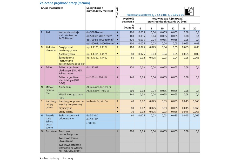 - Materiały odporne na wysokie temperatury, Tytan, Metale nieżelazne, twarde, Stopy na bazie kobaltu, Stal nierdzewna (INOX), Stopy na bazie niklu (np. Inconel i Hastelloy), Metale nieżelazne, miękkie, Stopy aluminium ciągliwe, Stale do 1200 N/mm² (< 38 HRC), Żeliwo, Stopy aluminium miękkie, Stal, Stale hartowane, ulepszone powyżej 1200 N/mm² (< 38 HRC), Termoplasty, Staliwo, Ferryt (materiał magnetyczny), twarde drewno, Aluminium, Nadstopy na bazie niklu lub tytanu, Płyta wiórowa, Brąz, Stal do nawęglania, Stale walcowe i łożyskowe, Cynk, Stale węglowe, Zendra, Miedź, Białe żeliwo ciągliwe (GTW, GJMW), Zendra odlewnicza, Mosiądz, Stal, staliwo, Czarne żeliwo ciągliwe (GTS, GJMB), Zendra walcownicza, Żeliwo szare i sferoidalne (GG/GJL, GGG/GJS), Stale powyżej 700 N/mm² (> 220 HB), Żeliwo sferoidalne, Inne metale nieżelazne, Żeliwo plastyczne, Tworzywa sztuczne, Stopy aluminium twarde, Drewno, Stopy tytanu