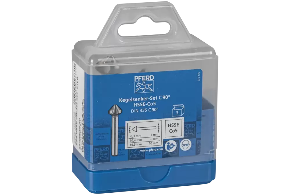 Zestawy zawierają wysokowydajne narzędzia pogłębiające o kącie pogłębiania 90° do pogłębiania wkrętów 90° do szczególnie twardych i wytrzymałych materiałów, takich jak stal stopowa i wysokowytrzymała oraz stal nierdzewna (INOX). Długa żywotność i wykonanie odporne na działanie temperatury dzięki zawartości ziarna ceramicznego. Odporne na pęknięcia opakowanie z tworzywa sztucznego chroni narzędzia przed uszkodzeniem i zabrudzeniem.