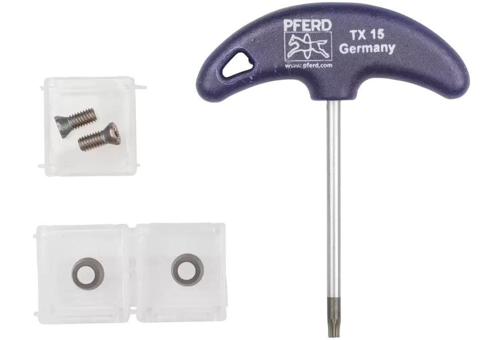 Za pomocą zestawu naprawczego firmy PFERD można wymieniać najpopularniejsze części w razie ich utraty lub uszkodzenia. Firma PFERD oferuje zarówno zestaw naprawczy do trzpieni otwornic, jak i również zestawy naprawcze do dysku High Speed Disc ALUMASTER oraz High Speed Torus Cutter., Do wymiany pojedynczych płytek skrawających narzędzia High Speed Disc ALUMASTER., Płytki skrawające pokryte są powłoką HICOAT.