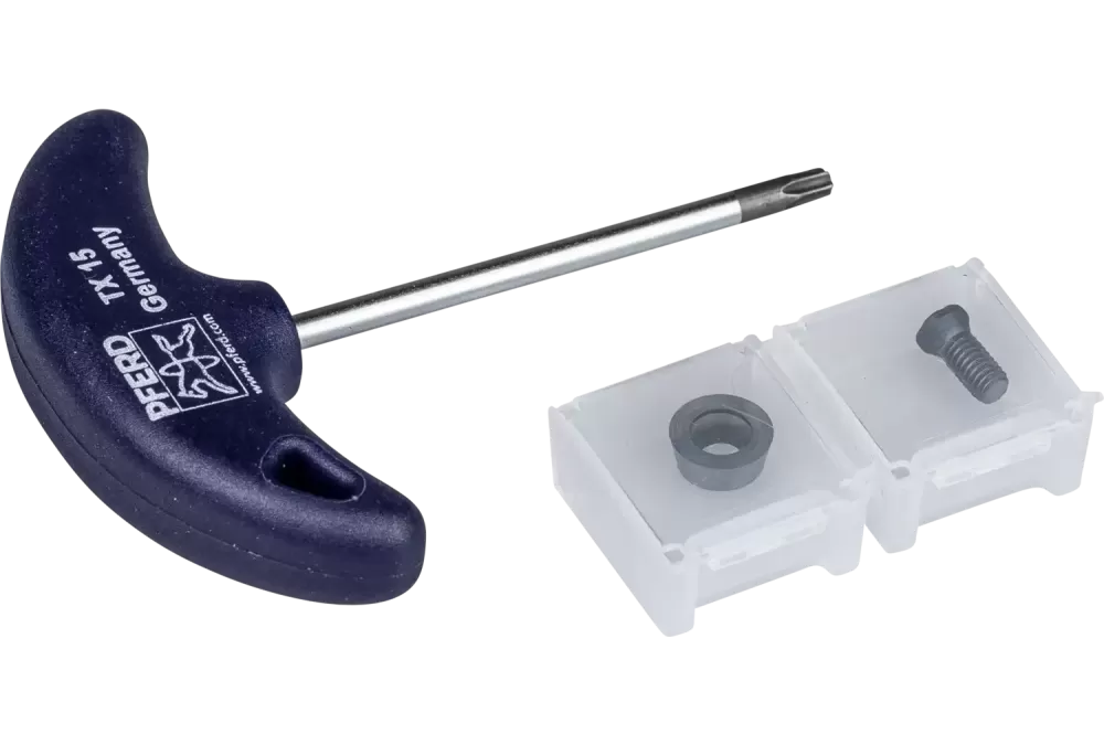 Za pomocą zestawu naprawczego firmy PFERD można wymieniać najpopularniejsze części w razie ich utraty lub uszkodzenia. Firma PFERD oferuje zarówno zestaw naprawczy do trzpieni otwornic, jak i również zestawy naprawcze do dysku High Speed Disc ALUMASTER oraz High Speed Torus Cutter., Do wymiany pojedynczych płytek skrawających w narzędziu High Speed Torus Cutter HSC-T 20.