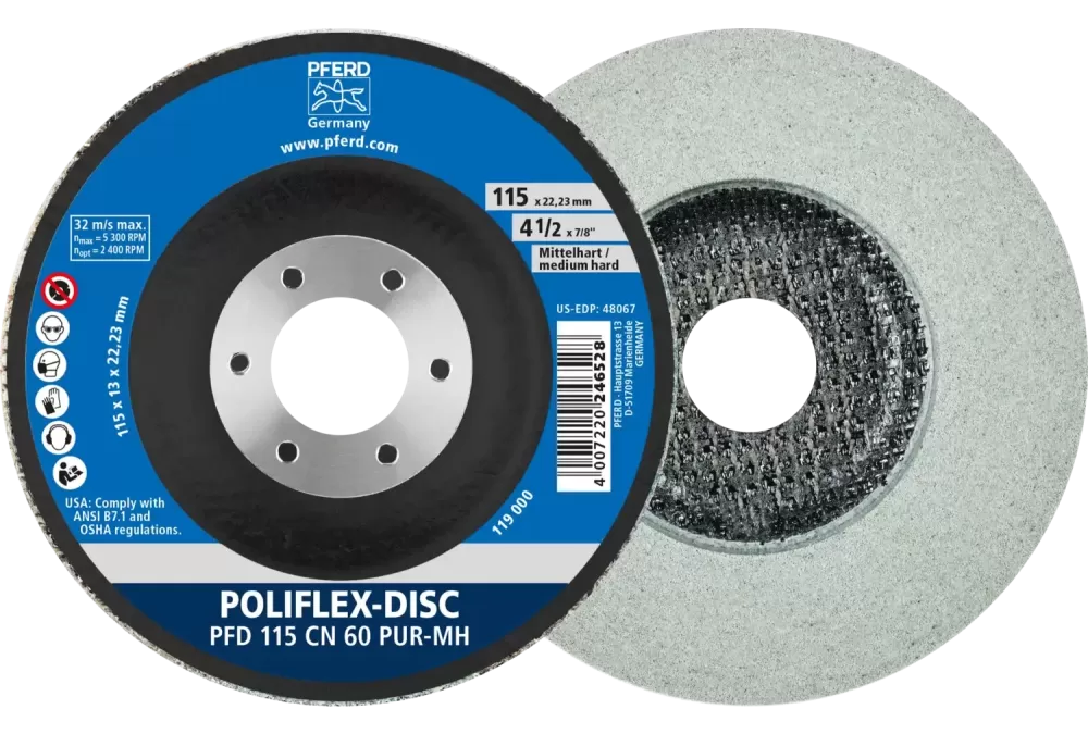 Dysk Poliflex PFD Ø 115 × 14 mm do otworu Ø 22,23 mm spoiwo PUR średnio twardy SIC60
