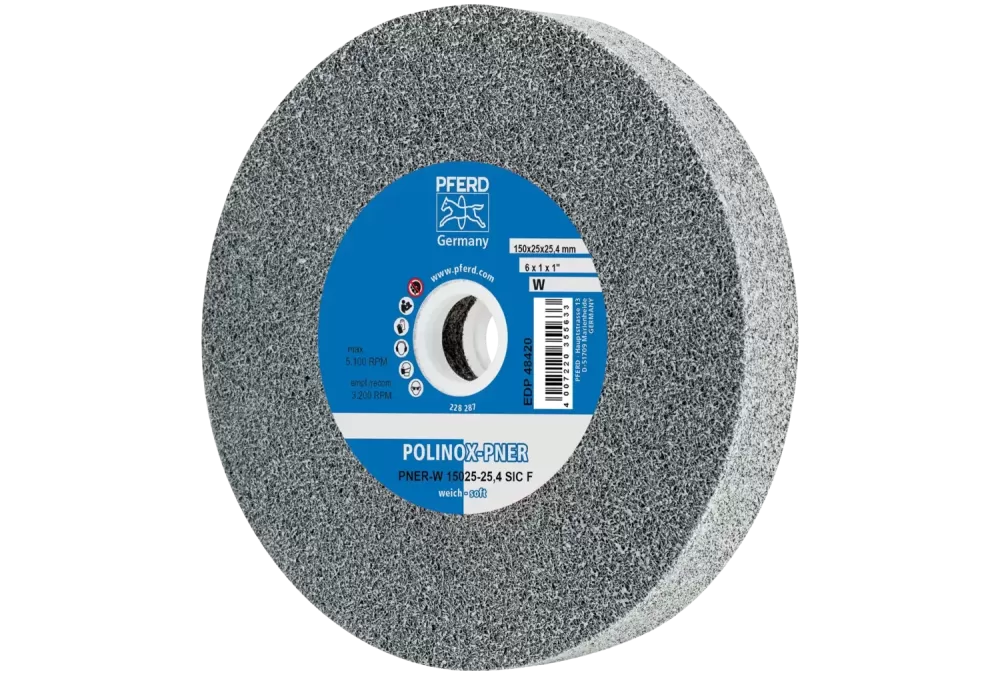 Dysk z włókniny prasowanej POLINOX PNER Ø 150 × 25 mm do otworu Ø 25,4 mm miękki SIC drobnoziarnisty do wykańczania