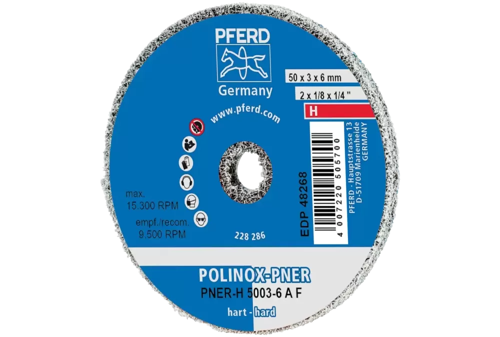Ściernice kompaktowe POLINOX PNER składają się z kilku silnie sprasowanych warstw włókniny połączonych specjalnym układem ziarno-żywica. Różne kombinacje zagęszczenia, włókien, ziarna oraz odpowiedniego spoiwa tworzą produkty z włókniny, które są idealne do prac wykończeniowych na powierzchniach, gwarantując jednocześnie wysoką wydajność pracy i długą żywotność. Narzędzia te tworzą szerokie spektrum w zakresie obróbki powierzchni, od szlifu zgrubnego po przygotowanie do polerowania.