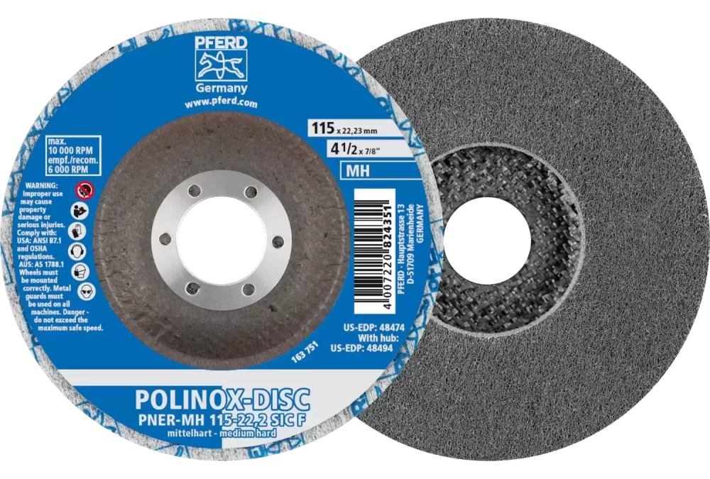 Dyski z włókniny sprasowanej POLINOX używane są na szlifierkach kątowych do szlifowania czołowego o regulowanym zakresie liczby obrotów. Nadają się do obróbki większych powierzchni. Włóknina sprasowana jest zamocowana na talerzu nośnym.