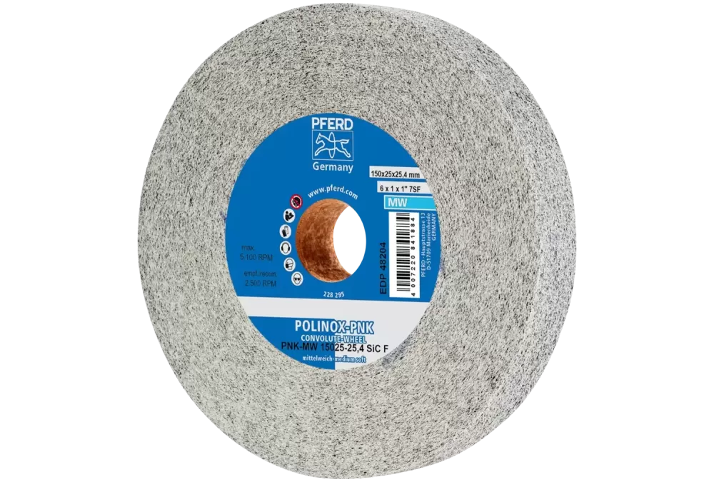 Krążek z nawiniętą włókniną POLINOX PNK Ø 150 × 25 mm do otworu Ø 25,4 mm średnio miękki SIC drobnoziarnisty do wykańczania
