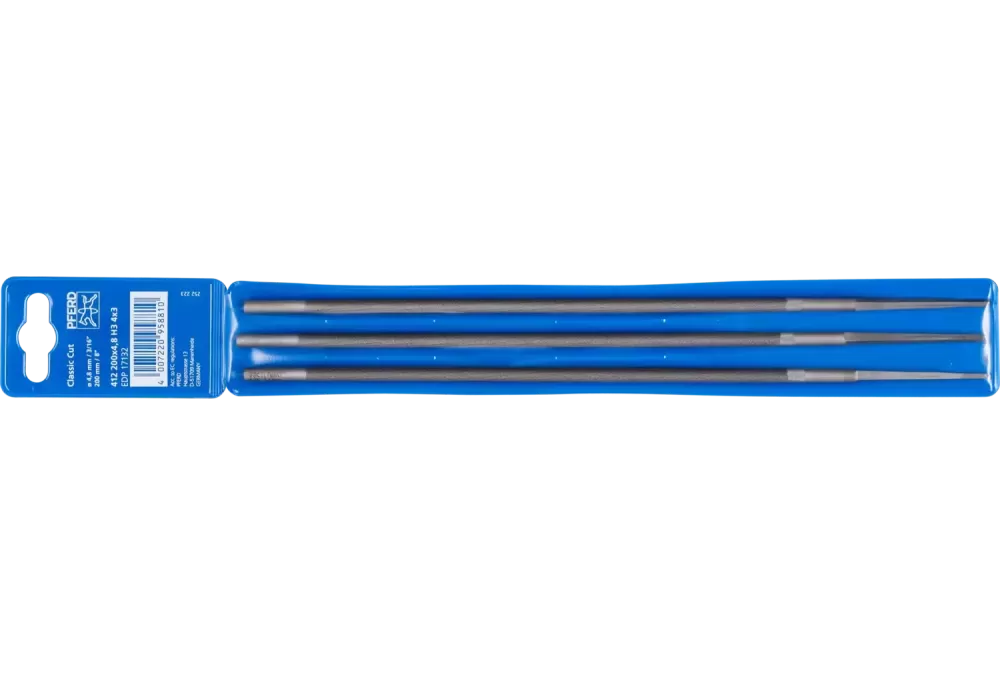 Trzy okrągłe pilniki z nacięciem spiralnym w specjalnym opakowaniu z tworzywa sztucznego chroniącym przed uszkodzeniem i zabrudzeniami.