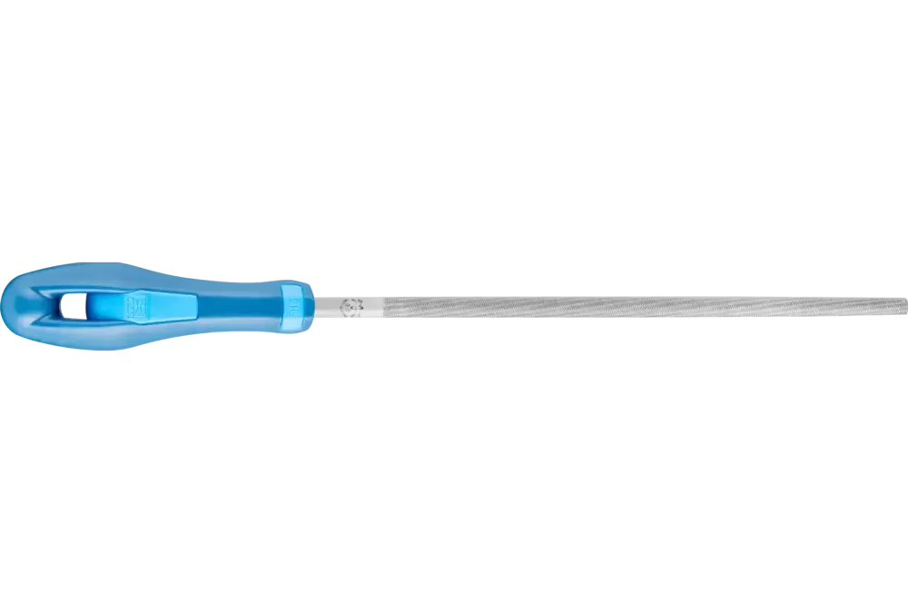 Pilnik okrągły, z nacięciami dookoła. Wykonanie z chwytem. Kształt F wg normy DIN 7261. Do obróbki profili okrągłych i półokrągłych.