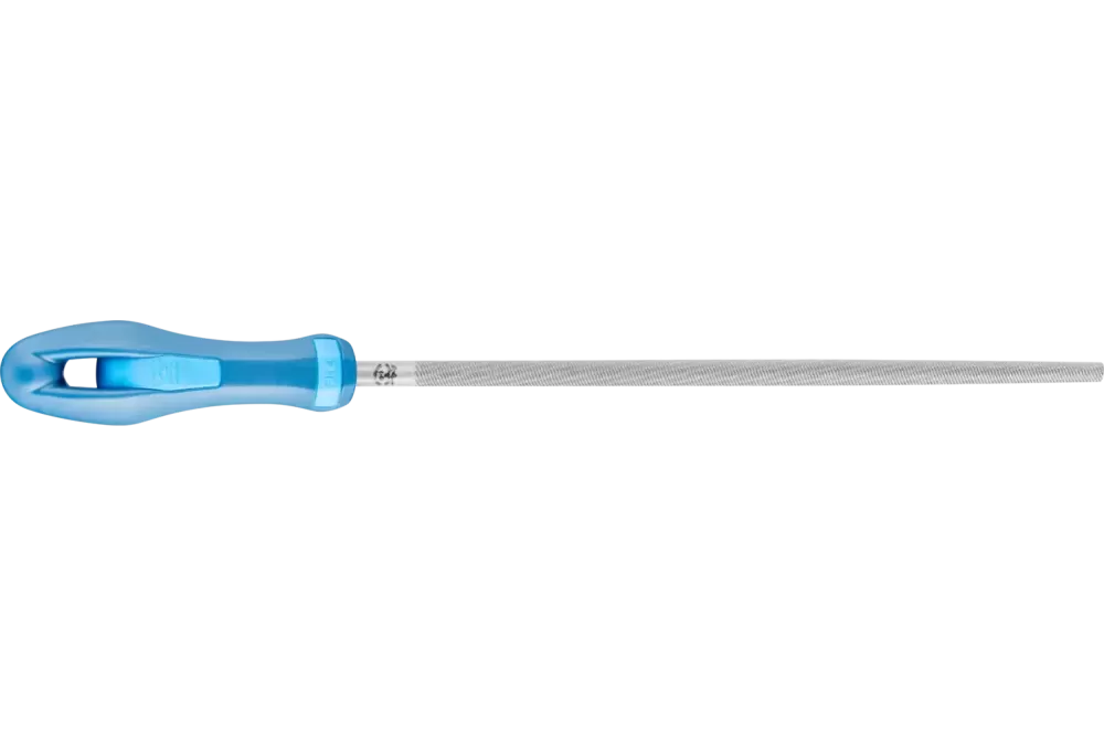 Pilnik okrągły, z nacięciami dookoła. Wykonanie z chwytem. Kształt F wg normy DIN 7261. Do obróbki profili okrągłych i półokrągłych.