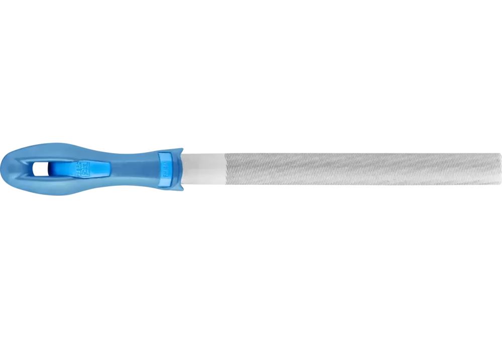 Pilnik półokrągły z nacięciami z dwóch stron. Wykonanie z chwytem. Kształt E wg normy DIN 7261. Do obróbki promieni i profili półokrągłych.