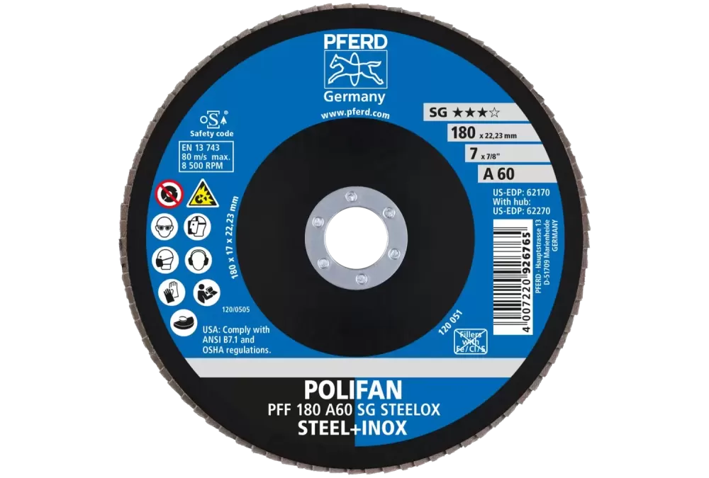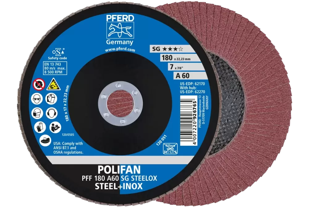Ściernica listkowa POLIFAN PFF 180 × 22,23 mm płaska A60 linia wydajna SG STEELOX stal/stal nierdzewna