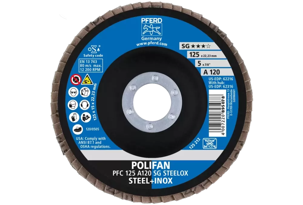 Ściernica listkowa POLIFAN PFC 125 × 22,23 mm stożkowa A120 SG STEELOX stal/stal nierdzewna