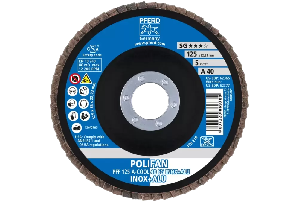 Ściernica listkowa POLIFAN PFF 125 × 22,23 mm płaska A-COOL 40 SG INOX+ALU stal nierdzewna/aluminium