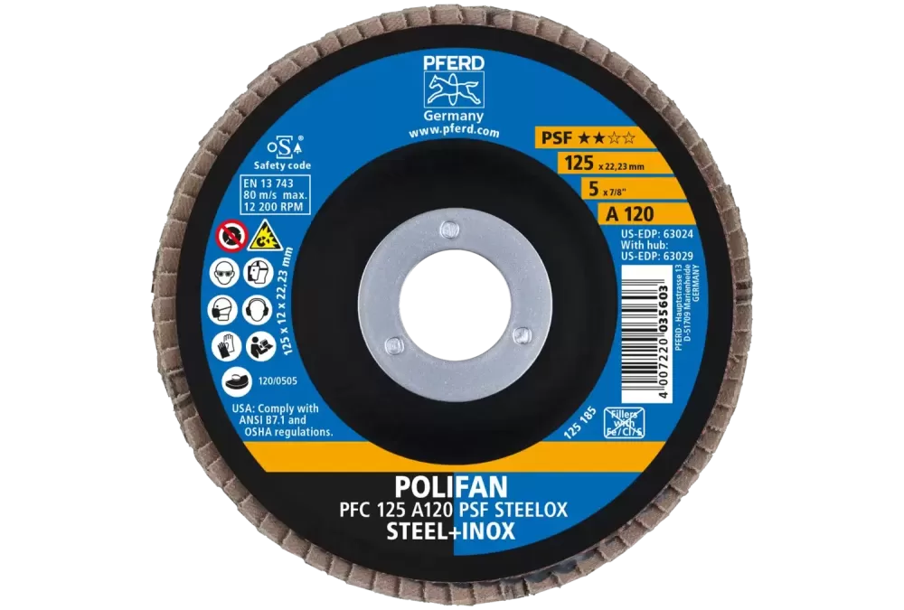 Ściernica listkowa POLIFAN PFC 125 × 22,23 mm stożkowa A120 linia uniwersalna PSF STEELOX stal/stal nierdzewna