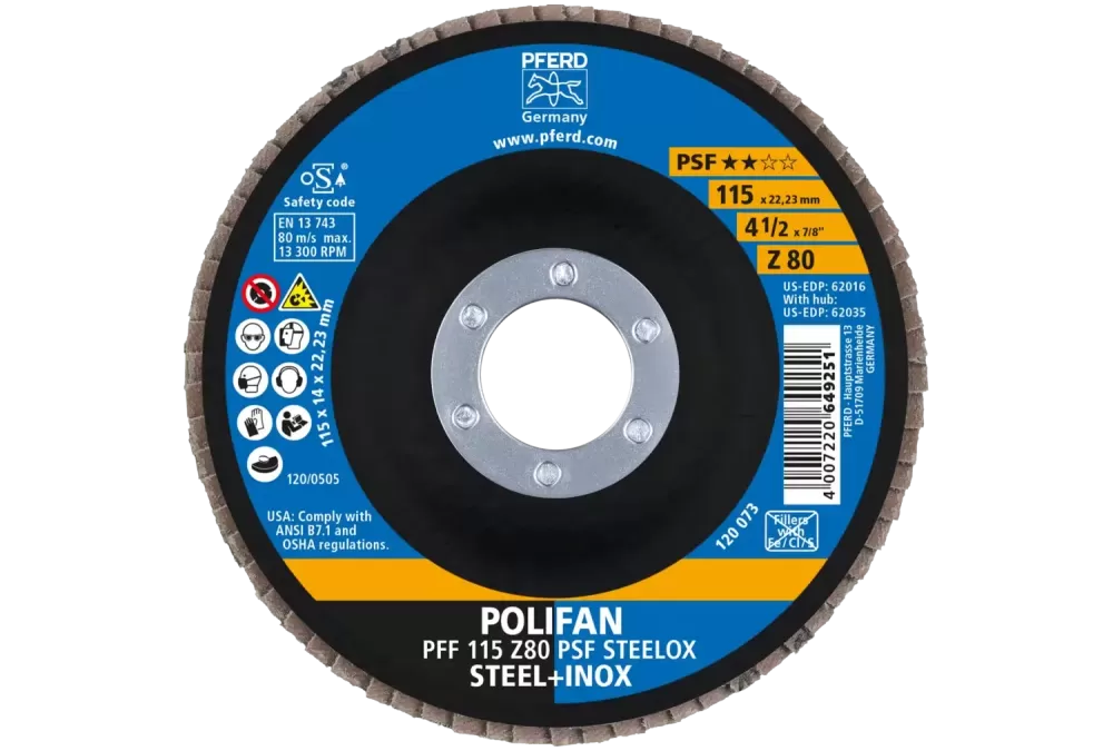 Ściernica listkowa POLIFAN PFF 115 × 22,23 mm płaska Z80 linia uniwersalna PSF STEELOX stal/stal nierdzewna
