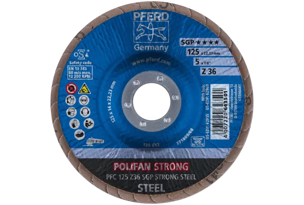 Ściernica listkowa POLIFAN STRONG PFC 125 × 22,23 mm stożkowa Z36 linia specjalna SGP STEEL do stali
