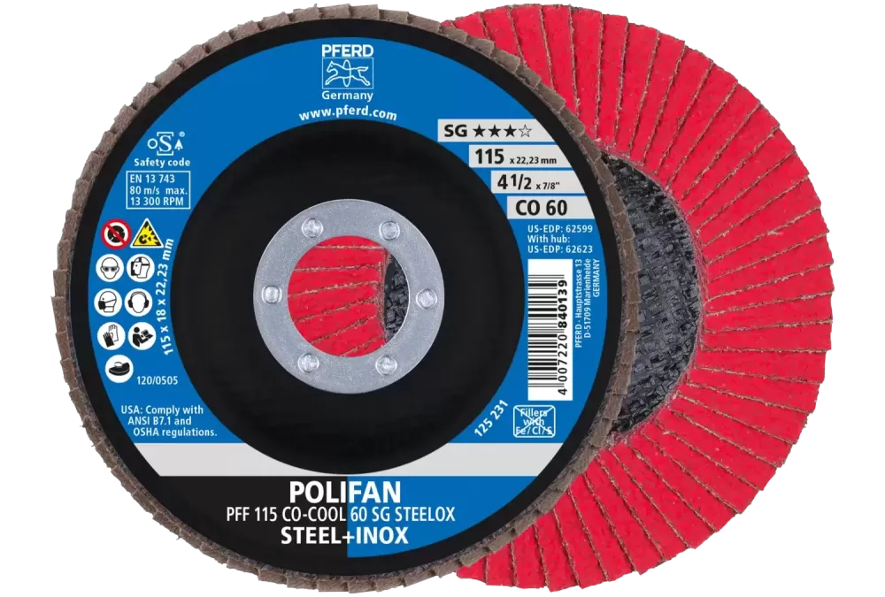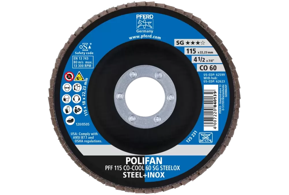Ściernica listkowa POLIFAN PFF 115 × 22,23 mm płaska CO-COOL 60 SG STEELOX stal/stal nierdzewna