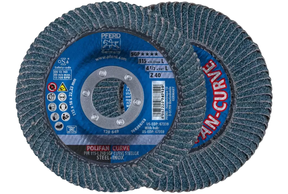 Opatentowana ściernica listkowa POLIFAN-CURVE została zaprojektowana specjalnie do obróbki spawów pachwinowych. Jest to jedyna tarcza ścierna na świecie, która w całości pokryta jest listkami ściernymi.