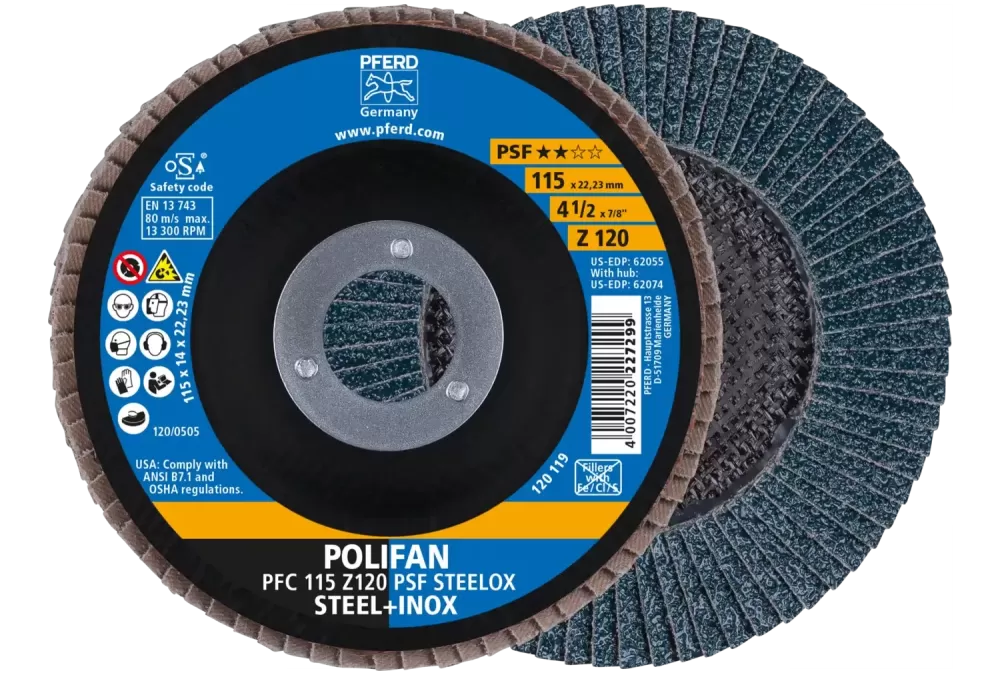 Ściernica listkowa POLIFAN PFC 115 × 22,23 mm stożkowa Z120 linia uniwersalna PSF STEELOX stal/stal nierdzewna