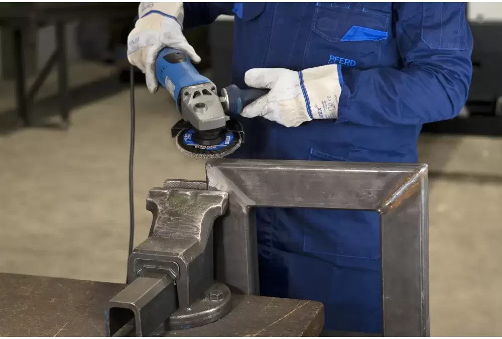 Narzędzie przeznaczone do szlifu powierzchniowego na stali., Ściernicę listkową trymować na ostrych metalowych krawędziach, za pomocą pilników lub płytek skrawających., Trymowanie może odbywać się wyłącznie pod kątem 45°., Ostrożnie zbliż narzędzie i zwiększaj nacisk, aż zaczną powstawać wióry. Kontynuuj naciskanie, aż narzędzie uzyska wybrany wymiar., Talerz wsporczy może być cofnięty maksymalnie tak daleko, żeby lamele wystawały na 5 mm.