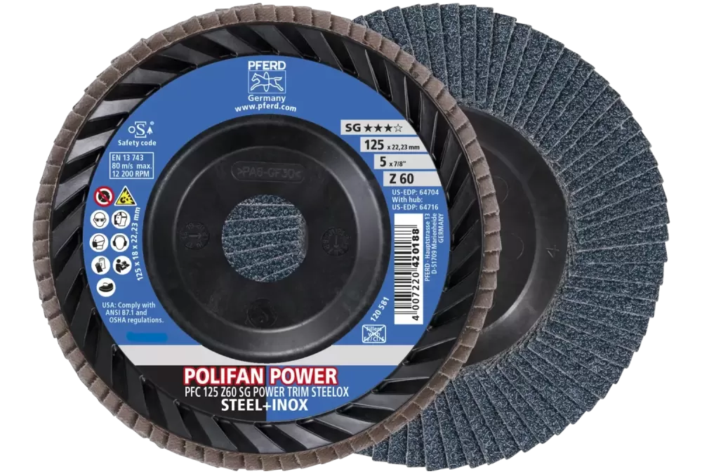 Ściernica listkowa POLIFAN POWER PFC 125 x 22,23 mm stożkowa Z60 linia wydajna SG TRIM STEELOX do stali/stali szlachetnej