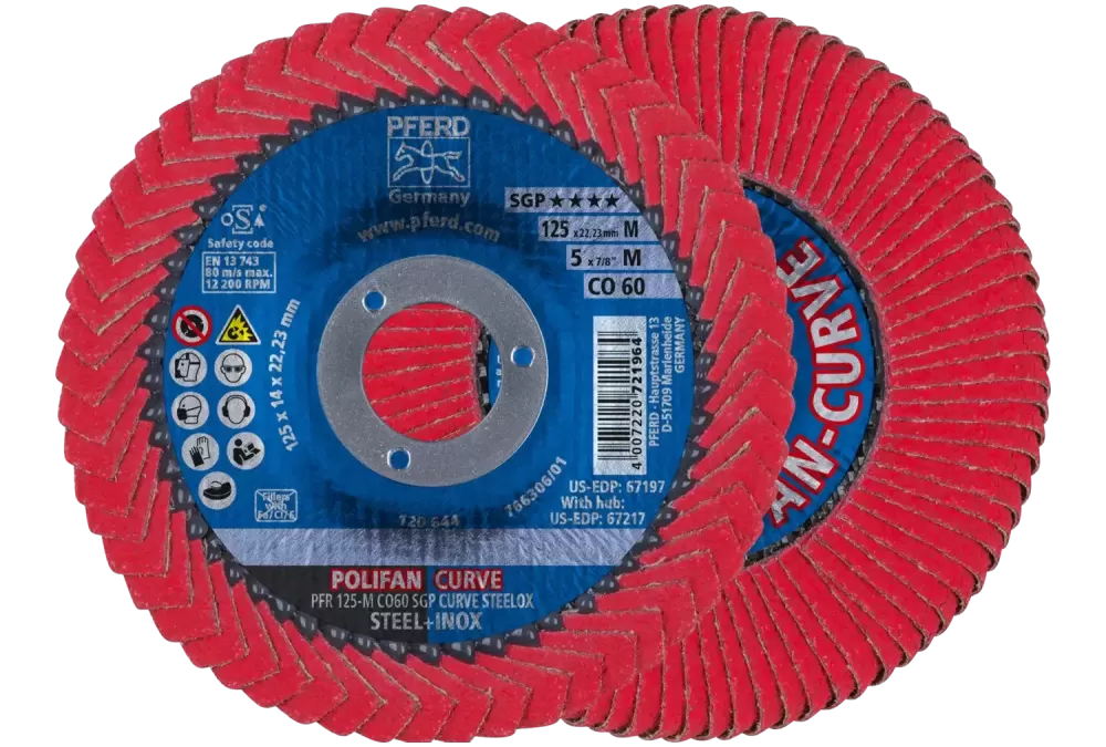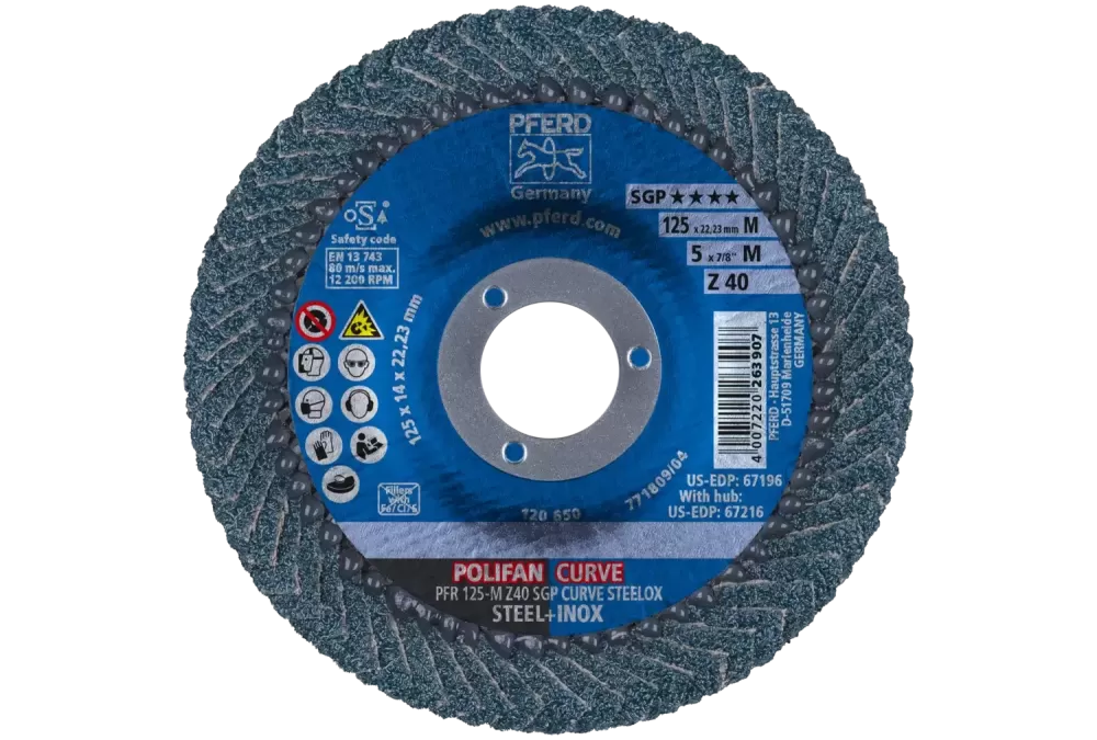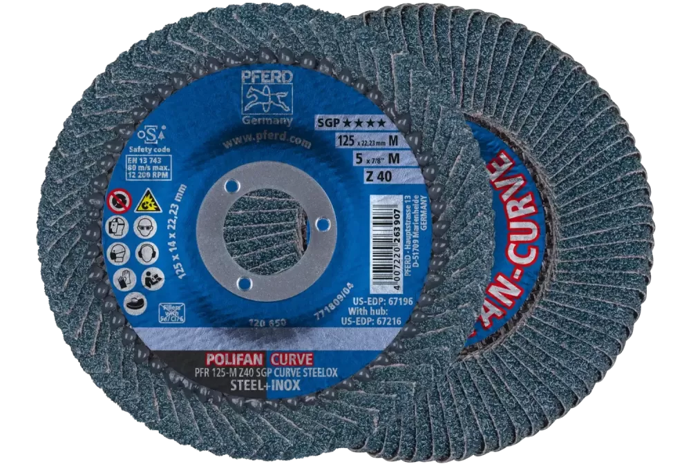 Narzędzia linii specjalnej SGP są zaprojektowane do zadań specjalnych i profesjonalnego zastosowania. Oferują użytkownikowi wyjątkowe zalety w porównaniu z konwencjonalnymi produktami. Co więcej, specjalna linia SGP zawiera narzędzia, które oferują najwyższą ekonomiczność ze względu na ich wyjątkowo wysoką wydajność użytkowania., Ściernica listkowa POLIFAN-CURVE została opracowana specjalnie do obróbki spawów pachwinowych. Jest to jedyna tarcza ścierna na świecie, która w całości pokryta jest lamelami ściernymi., Rozwiązanie POLIFAN CURVE firmy PFERD jest opatentowane w wielu krajach świata., Wysokowydajna ściernica listkowa do najbardziej wymagających zadań obróbczych na stali i stali nierdzewnej (INOX).