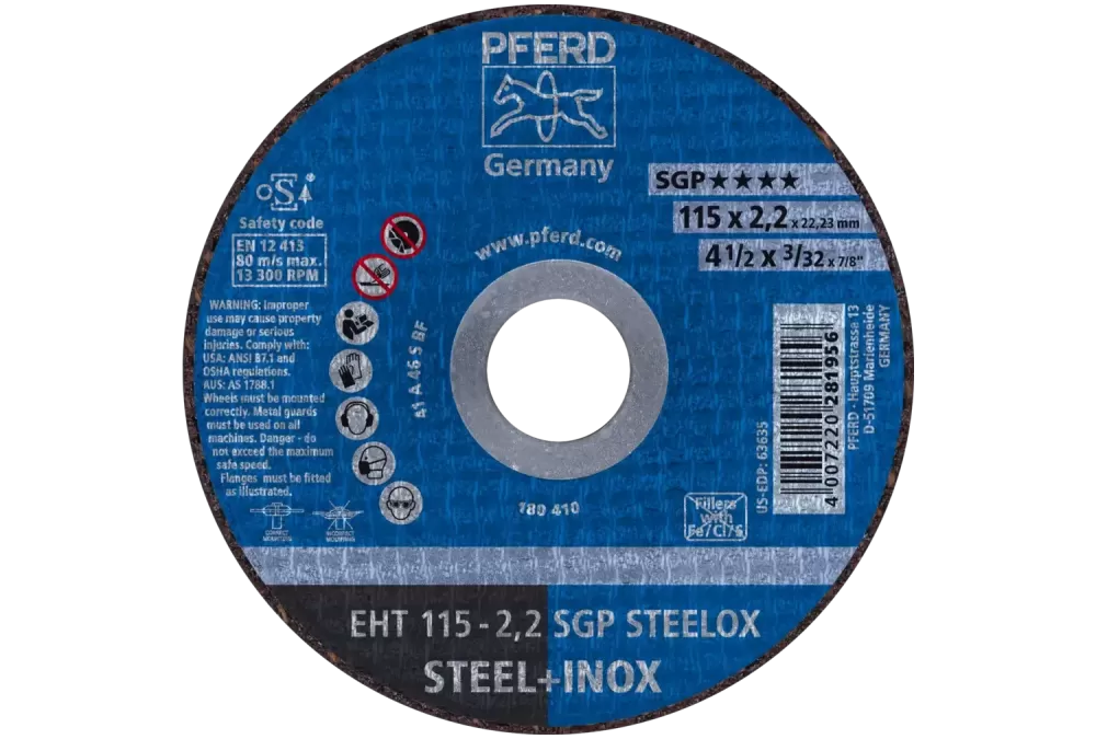 Ściernica tarczowa do cięcia EHT 115 × 2,2 × 22,23 mm prosta linia specjalna SGP STEELOX do stali/stali szlachetnej