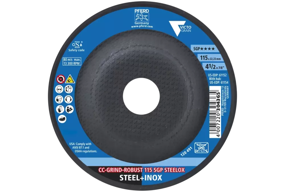 Narzędzia linii specjalnej SGP są zaprojektowane do zadań specjalnych i profesjonalnego zastosowania. Oferują użytkownikowi wyjątkowe zalety w porównaniu z konwencjonalnymi produktami. Co więcej, specjalna linia SGP zawiera narzędzia, które oferują najwyższą ekonomiczność ze względu na ich wyjątkowo wysoką wydajność użytkowania., Tarcza CC-GRIND ROBUST firmy PFERD stanowi nowoczesną, wysokowydajną i ergonomiczną alternatywę dla ściernicy tarczowej do zdzierania, ściernicy listkowej i tarczy włókninowej., Rozwiązanie CC-GRIND ROBUST marki PFERD jest opatentowane w wielu krajach świata., Ściernica tarczowa z precyzyjnie uformowanym, trójkątnym wysokowydajnym ziarnem ściernym VICTOGRAIN do stali i stali nierdzewnej (INOX) o najwyższych właściwościach szlifowania i ponadprzeciętnej wydajności., Produkty VICTOGRAIN należą do najbardziej wydajnych narzędzi na świecie. Precyzyjnie uformowane, trójkątne ziarno ścierne PFERD zapewnia wyjątkowe efekty. Kształt i wielkość ziarna ściernego VICTOGRAIN pozwala na pracę narzędziem pod najbardziej optymalnym kątem. Pojedyncze ziarna potrzebują wtedy niewiele energii, aby wnikać w obrabianą powierzchnię. Korzyści płynące dla użytkownika to przede wszystkim szybki postęp pracy, wysoka żywotność narzędzia, niższa temperatura szlifowania, niższe zapotrzebowanie energetyczne napędu narzędzia. Ziarna ścierne VICTOGRAIN są przymocowane jednym bokiem trójkąta do korpusu. Dzięki temu są wyjątkowo dobrze związane i w połączeniu z wąskim kształtem oferują wyjątkowo dużą przestrzeń na materiał, przez co proces szlifowania jest jeszcze bardziej efektywny.Także strukturalna budowa trójkątów VICTOGRAIN jest specjalnie dostosowana. Bardzo małe kryształki w trójkącie oferują optymalną wydajność ścierania: Zawsze dostępne są bardzo ostre krawędzie tnące, ale tylko niezbędna minimalna część ziarna ściernego / trójkąta odrywa się.Kombinacja tych cech zapewnia użytkownikowi najwyższy komfort stałej wydajności pracy podczas szlifu chłodnego, a także wysoką żywotność przy osiąganiu równomiernej szorstkości powierzchni.