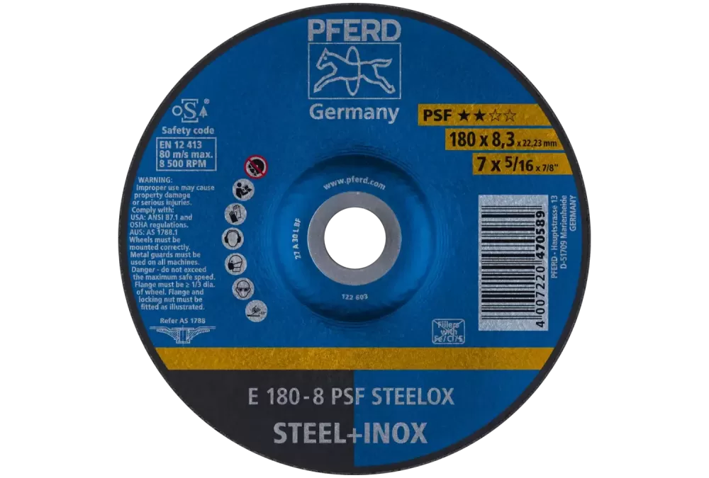 Ściernica tarczowa do zdzierania E 180 × 8,3 × 22,23 mm linia uniwersalna PSF STEELOX do stali/stali nierdzewnej
