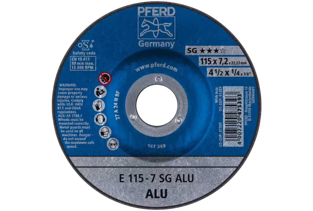 Ściernica tarczowa do zdzierania E 115 × 7,2 × 22,23 mm linia wydajna SG ALU do aluminium