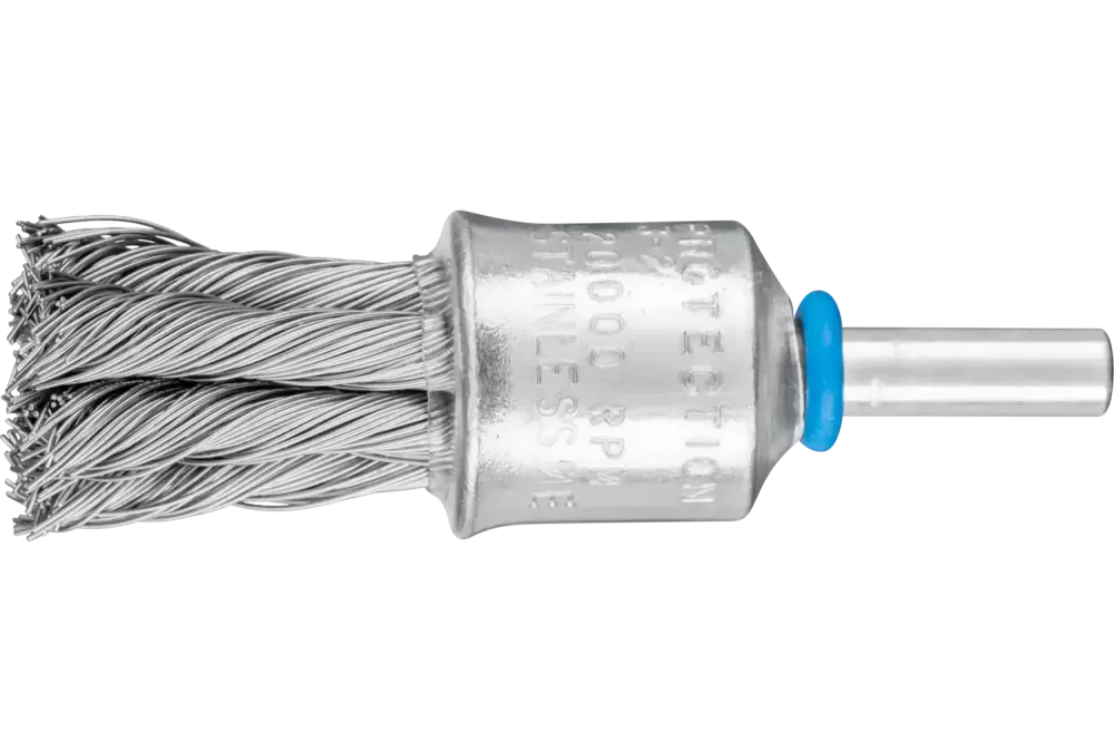 Agresywna praca szczotki. Do średnio ciężkich prac, takich jak gratowanie, czyszczenie oraz usuwanie rdzy, zgorzeliny i odprysków ze spawania., Szczotka-pędzelek w osłonie z tworzywa sztucznego., Aby móc sprostać stawianym wymaganiom obróbczym w zakresie stali szlachetnej (INOX), firma PFERD przy produkcji szczotek ze stali INOX używa drutu 1.4310 (V2 A). Doświadczenia z wcześniejszych praktyk potwierdzają, że ten rodzaj drutu gwarantuje odporność na korozję przy optymalnej żywotności. Wszystkie szczotki PFERD z drutem INOX są oznaczone na niebiesko i nadają się do użycia na wysokostopowej stali szlachetnej (INOX), np. V4 A. Drut 1.4310 podczas utwardzania nabiera ferromagnetycznych właściwości, tzn. jest przyciągany przez magnesy. Jest to spowodowane zmianą strukturalną wywoływaną przez przeformowanie, np. w procesie ciągnienia. Nie ma to jednak wpływu na jakość ani odporność na korozję wypełnienia INOX. Drut zachowuje swoją odporność na korozję. Jest to spowodowane zmianą strukturalną wywoływaną przez przeformowanie, np. w procesie ciągnienia. Nie ma to jednak wpływu na jakość ani odporność na korozję wypełnienia INOX. Drut utrzymuje swoje odporne na korozję właściwości., Drut ze stali nierdzewnej (INOX) odporny na temperaturę do 450 °C.