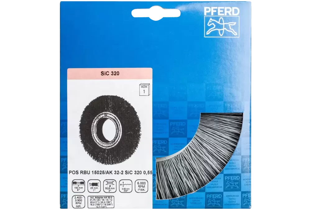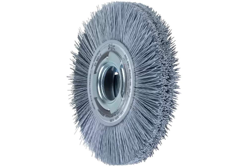 Szczotka tarczowa szeroka niepleciona RBU Ø150 × 25x różne otwory włókno SiC Ø0,55 mm ziarno 320 szlifierka stacjonarna
