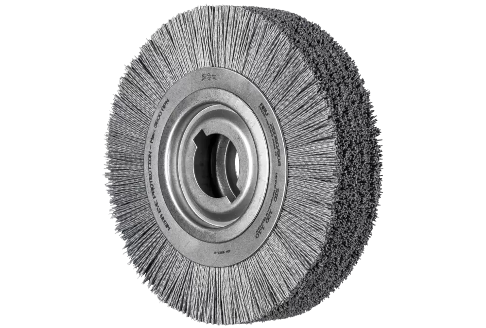 Szczotka do usuwania gratów, niepleciona RBU Ø250 × 60 × 50,8 mm, otwór, włókno SiC Ø1,10 mm, ziarno 120, stacjonarna
