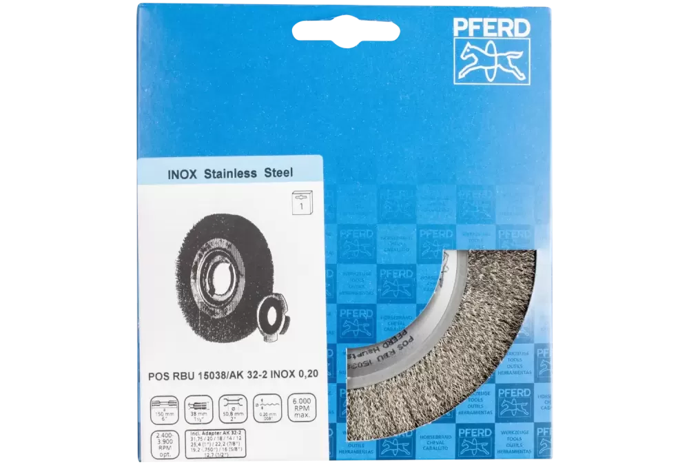 Szczotka tarczowa szeroka niepleciona RBU Ø 150 × 38x różne otwory drut ze stali nierdzewnej Ø 0,20 szlifierka stacjonarna