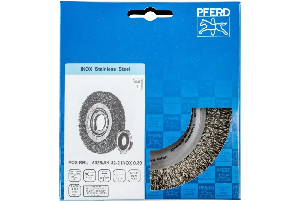 Szczotka tarczowa szeroka niepleciona POS RBU Ø150 × 25x różne otwory drut ze stali nierdzewnej Ø0,30 szlifierka stacjonarna