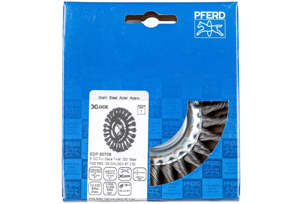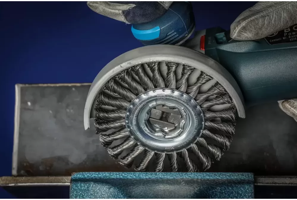 Agresywna praca szczotki. Do ciężkich prac w przemyśle metalowym, takich jak usuwanie zgorzeliny, rdzy, gratowanie, czyszczenie spawów, usuwanie resztek kleju oraz odprysków ze spawania., System mocowania X-LOCK firmy Bosch do szlifierek kątowych umożliwia szybką i komfortową wymianę narzędzi. Zamiast okrągłego otworu, system mocowania X-LOCK zapewnia kontur w kształcie litery x, co umożliwia kształtowe mocowanie narzędzia w szlifierce kątowej. Gwarantuje to bezpieczne mocowanie wszelkiego rodzaju narzędzi w krótkim czasie. Ten wyjątkowy system spełnia najwyższe standardy jakości i bezpieczeństwa i może być używany w trudnych warunkach eksploatacji. X-LOCK firmy Bosch to pierwszy na świecie system szybkiej wymiany narzędzi w szlifierkach kątowych: Wystarczy umieścić narzędzie w uchwycie X-LOCK, kliknąć – i gotowe. Wymiana osprzętu w szlifierkach kątowych jeszcze nigdy nie była tak prosta. X-LOCK stanowi nowy standard, który ułatwia pracę profesjonalistom i zwiększa wydajność. Bosch Power Tools stawia na silnych partnerów, takich jak PFERD. Firma PFERD opracowała zasadę łączenia elementów wykrawanych X-LOCK z materiałami ściernymi wiązanymi spoiwem, ściernicami listkowymi i szczotkami, a także stworzyła warunki do ich produkcji na skalę przemysłową., Drut stalowy jest najczęściej wykorzystywanym rodzajem drutu. Szczotki z wypełnieniem z drutu stalowego nadają się szczególnie do obróbki powierzchni i gratowania. Specjalny drut PFERD charakteryzuje się wysoką wytrzymałością na rozciąganie i gięcie. Zapewnia to optymalne zużycie drutu i długą żywotność, nawet w ekstremalnych zastosowaniach szczotek., Drut stalowy wytrzymuje temperatury do 300 °C.
