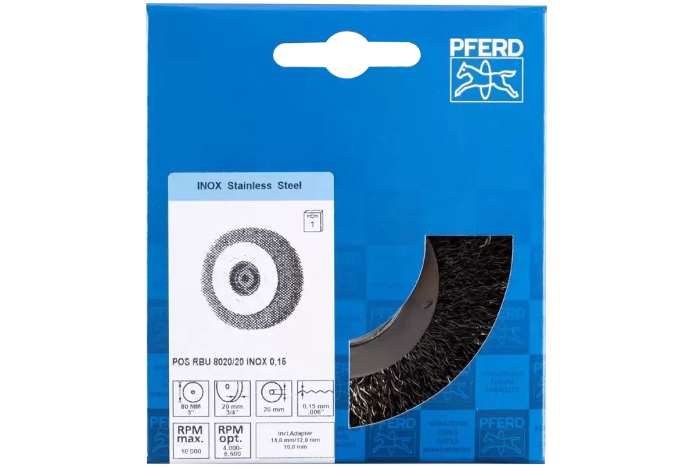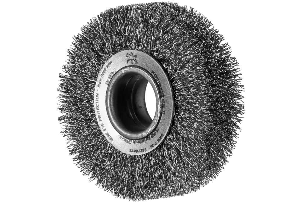 Znakomite do prac średnio ciężkich na dużych powierzchniach. Zastosowanie maszynowe i ręczne., Aby móc sprostać stawianym wymaganiom obróbczym w zakresie stali szlachetnej (INOX), firma PFERD przy produkcji szczotek ze stali INOX używa drutu 1.4310 (V2 A). Doświadczenia z wcześniejszych praktyk potwierdzają, że ten rodzaj drutu gwarantuje odporność na korozję przy optymalnej żywotności. Wszystkie szczotki PFERD z drutem INOX są oznaczone na niebiesko i nadają się do użycia na wysokostopowej stali szlachetnej (INOX), np. V4 A. Drut 1.4310 podczas utwardzania nabiera ferromagnetycznych właściwości, tzn. jest przyciągany przez magnesy. Jest to spowodowane zmianą strukturalną wywoływaną przez przeformowanie, np. w procesie ciągnienia. Nie ma to jednak wpływu na jakość ani odporność na korozję wypełnienia INOX. Drut zachowuje swoją odporność na korozję. Jest to spowodowane zmianą strukturalną wywoływaną przez przeformowanie, np. w procesie ciągnienia. Nie ma to jednak wpływu na jakość ani odporność na korozję wypełnienia INOX. Drut utrzymuje swoje odporne na korozję właściwości., Drut ze stali nierdzewnej (INOX) odporny na temperaturę do 450 °C., Opracowane pod kątem uniwersalnego zastosowania w warsztatach.
