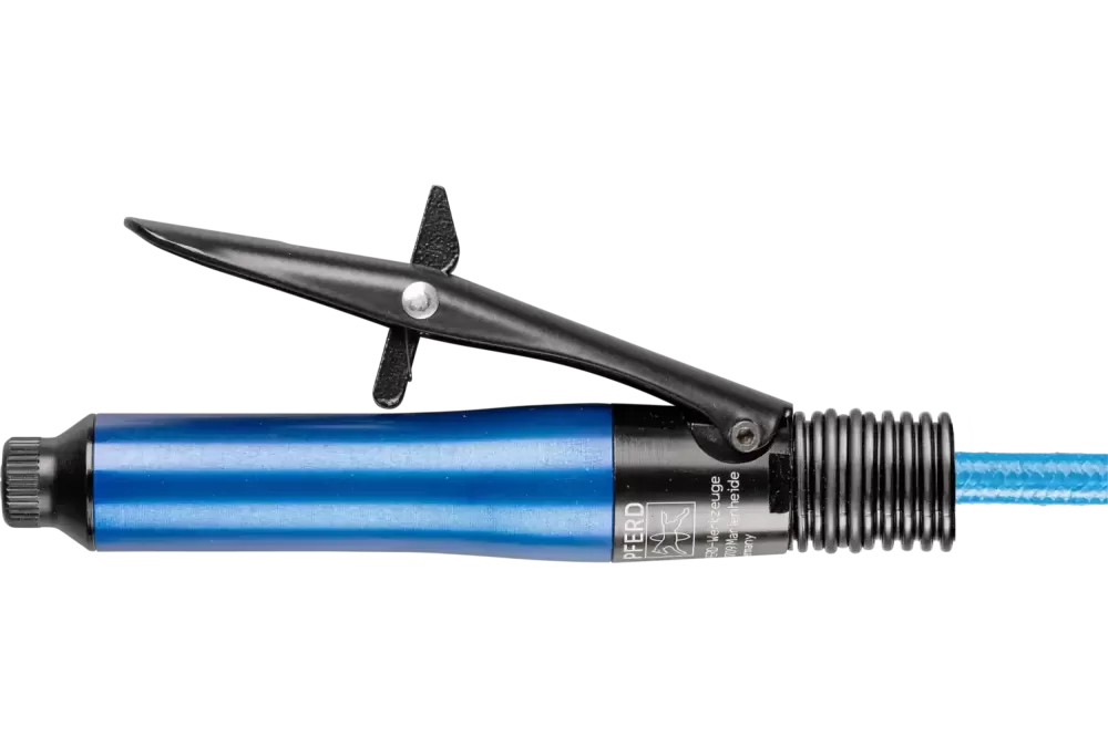 Napęd jest wyposażony w uchwyt narzędziowy z tuleją zaciskową do narzędzi trzpieniowych., Kanał powietrza wylotowego napędu pneumatycznego znajduje się z tyłu., Ten lekki i poręczny napęd pneumatyczny charakteryzuje się wysoką prędkością obrotową. Jest wyposażony w zdejmowaną osłonę wrzeciona. Napęd może być eksploatowany tylko z olejem., Dzięki zaworowi suwakowemu napęd posiada funkcję wyłącznika bezpieczeństwa.