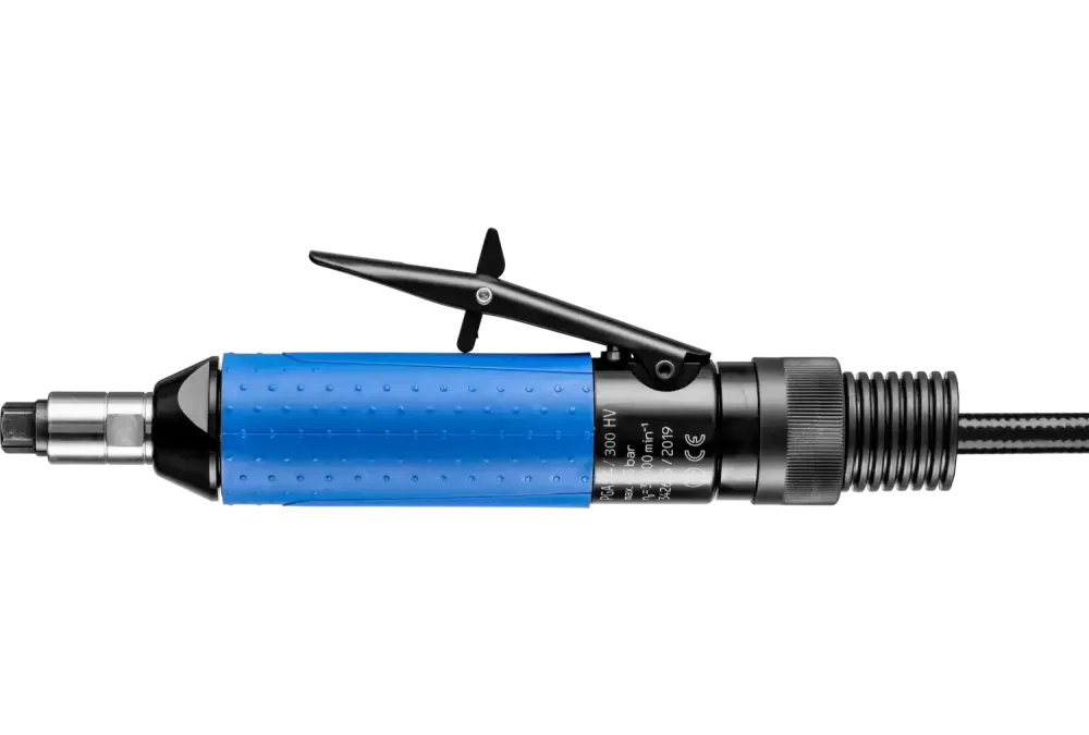 Napęd jest wyposażony w uchwyt narzędziowy z tuleją zaciskową do narzędzi trzpieniowych., Kanał powietrza wylotowego napędu pneumatycznego znajduje się z tyłu., Napęd pneumatyczny musi być eksploatowany z olejem. Dzięki zaworowi suwakowemu napęd posiada funkcję wyłącznika bezpieczeństwa., Wydajne przy kompaktowej konstrukcji.