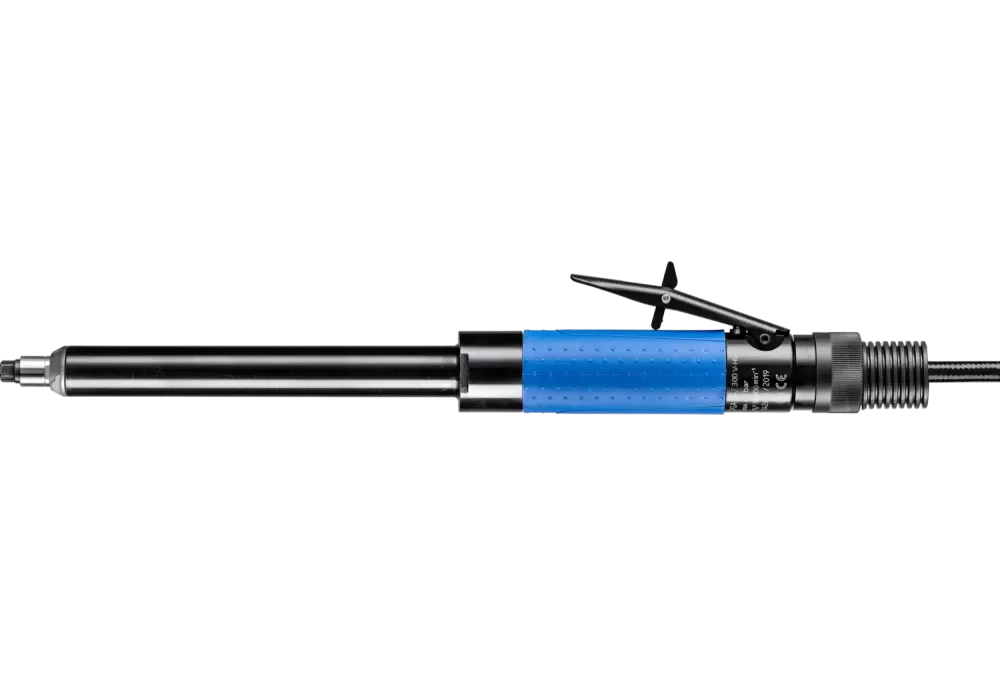 Napęd jest wyposażony w uchwyt narzędziowy z tuleją zaciskową do narzędzi trzpieniowych., Kanał powietrza wylotowego napędu pneumatycznego znajduje się z tyłu., Napęd pneumatyczny musi być eksploatowany z olejem. Dzięki zaworowi suwakowemu napęd posiada funkcję wyłącznika bezpieczeństwa., Dzięki przedłużonej konstrukcji napęd optymalnie nadaje się do pracy w trudno dostępnych miejscach.
