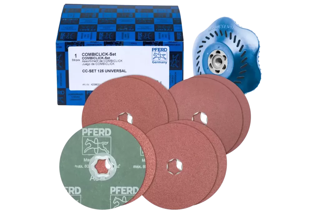 Zestaw tarcz fibrowych COMBICLICK korund Ø 125 mm A36, 60, 80, 120 z talerzem podporowym CC-H-GT do zastosowań uniwersalnych