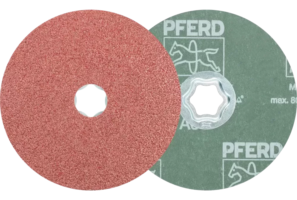 System COMBICLICK składa się ze specjalnie zaprojektowanego talerza wsporczego oraz stabilnego uchwytu na odwrotnej stronie narzędzia. Wraz z talerzem wsporczym narzędzia COMBICLICK mogą być używane na powszechnie dostępnych szlifierkach kątowych. Specjalny kształt kanału chłodzącego powoduje lepszy przepływ powietrza, znacznie redukujący termiczne obciążenia materiału ściernego oraz detalu obrabianego. System szybkomocujący, stabilny uchwyt, pewne osadzenie narzędzia i optymalny system chłodzący powodują do 30% niższą temperaturę przedmiotu obrabianego, do 25% większą wydajność skrawania, do 30% dłuższą żywotność oraz lepsze wykorzystanie materiału ściernego., Tarcze fibrowe firmy PFERD zostały wyprodukowane zgodnie z normą ISO 16057 w kształcie A1 wykonanie F pod nazwą „Wulkanizowane ściernice fibrowe”., Do uniwersalnych prac szlifierskich od szlifu zgrubnego po szlif precyzyjny w przemyśle i rzemiośle.
