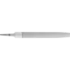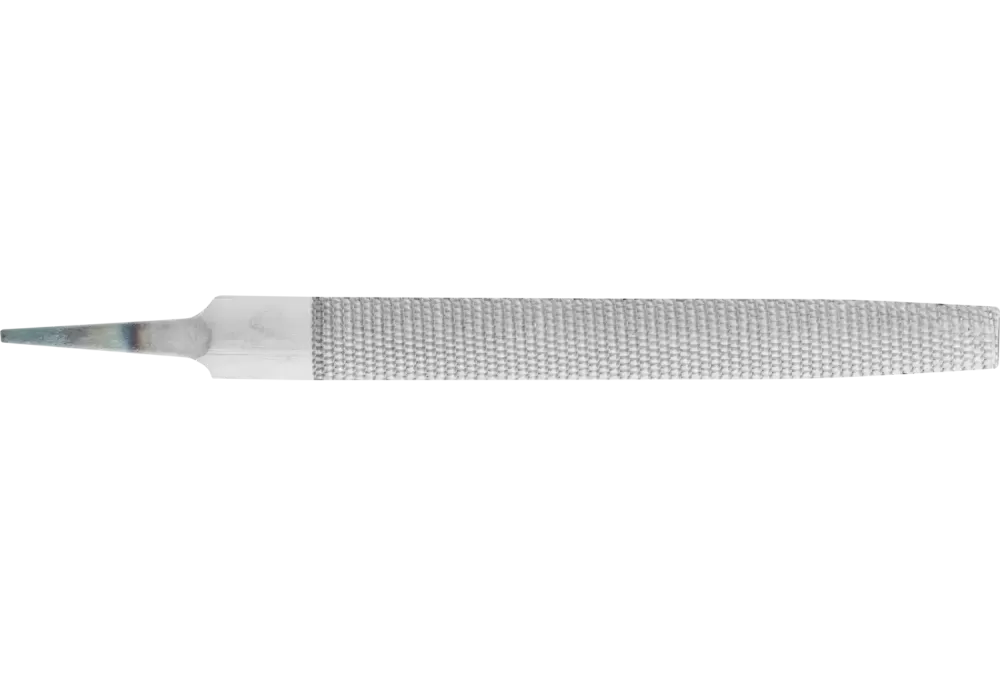 Pilnik półokrągły, zbieżny, z nacięciem raszplowym z dwóch stron. Kształt D wg normy DIN 7263. Wykonanie z chwytem. Wykonanie bardziej płaskie i szersze w porównaniu z raszplami półokrągłymi. Do obróbki powierzchni, promieni, profili półokrągłych i krawędzi (fazowanie i zaokrąglanie).