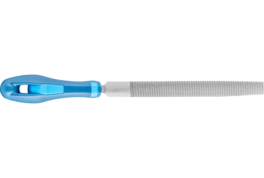 Pilnik półokrągły, zbieżny, z nacięciem raszplowym z dwóch stron. Kształt C wg normy DIN 7263. Wykonanie z chwytem.
