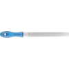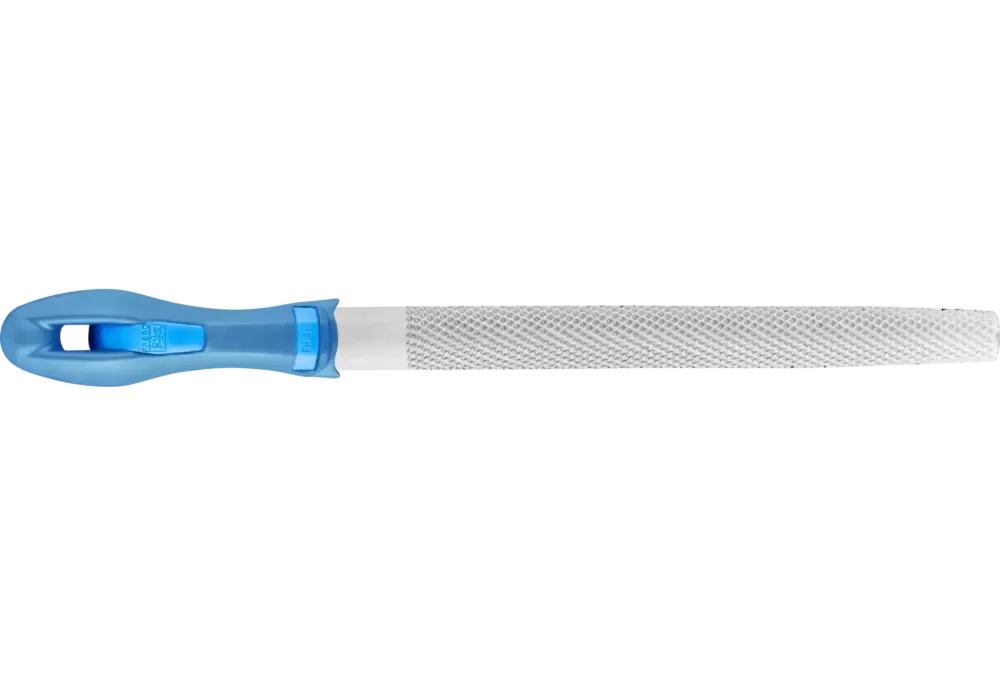 Pilnik półokrągły, zbieżny, z nacięciem raszplowym z dwóch stron. Kształt C wg normy DIN 7263. Wykonanie z chwytem.