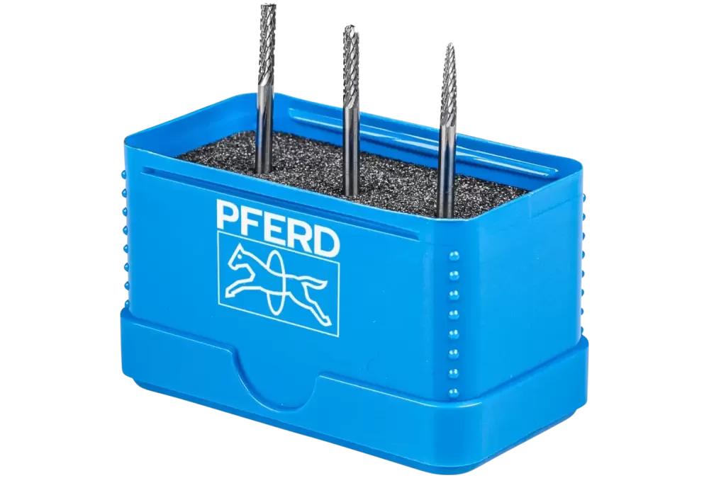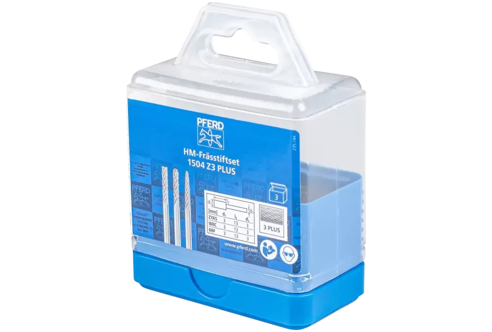 Uzębienie 3 PLUS krzyżowe nadaje się szczególnie do zgrubnej obróbki żeliwa, stali, stali szlachetnej (INOX) oraz stopów na bazie niklu i tytanu. Charakteryzuje się bardzo wysoką wydajnością usuwania materiału przy obróbce ubytkowej., Trzpienie frezarskie ze stopów twardych do uniwersalnych zastosowań są odpowiednie do precyzyjnej i zgrubnej obróbki najważniejszych materiałów stosowanych w przemyśle. Gwarantują dobrą wydajność pracy i mogą być stosowane na różnych materiałach., Zestaw 1504 PLUS zawiera trzy małe trzpienie frezarskie ze stopów twardych z uzębieniem 3, w najczęściej używanych kształtach i wymiarach do zastosowania w warsztacie. Odporne na pęknięcia opakowanie z tworzywa sztucznego chroni narzędzia przed uszkodzeniem i zabrudzeniem.