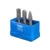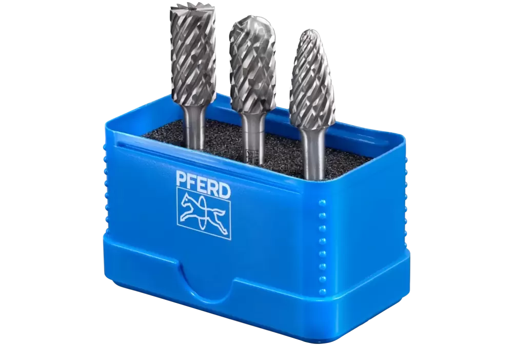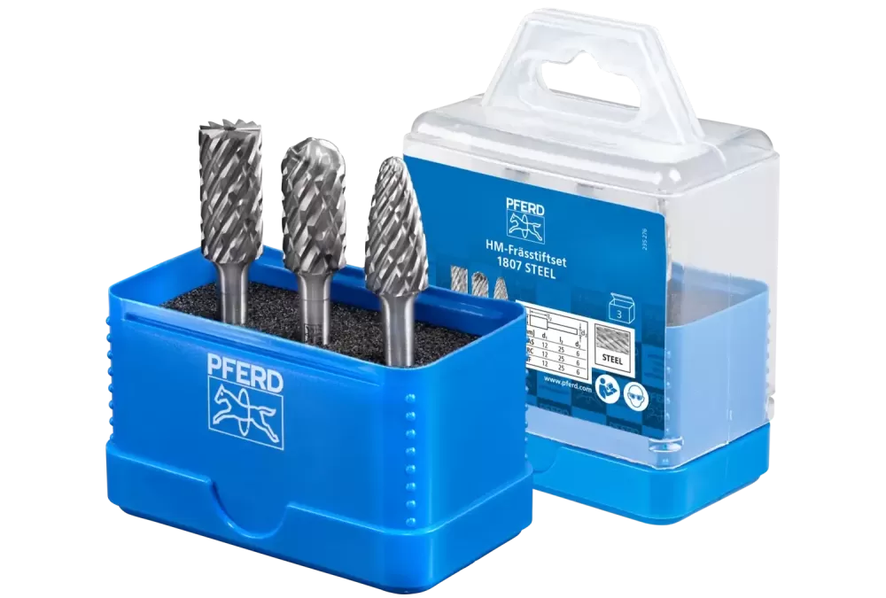 Zestaw 1807 STEEL zawiera trzy trzpienie frezarskie ze stopów twardych, przeznaczonych do obróbki stali i staliwa w najczęściej używanych kształtach i wymiarach. Odporne na pęknięcia opakowanie z tworzywa sztucznego chroni narzędzia przed uszkodzeniem i zabrudzeniem.